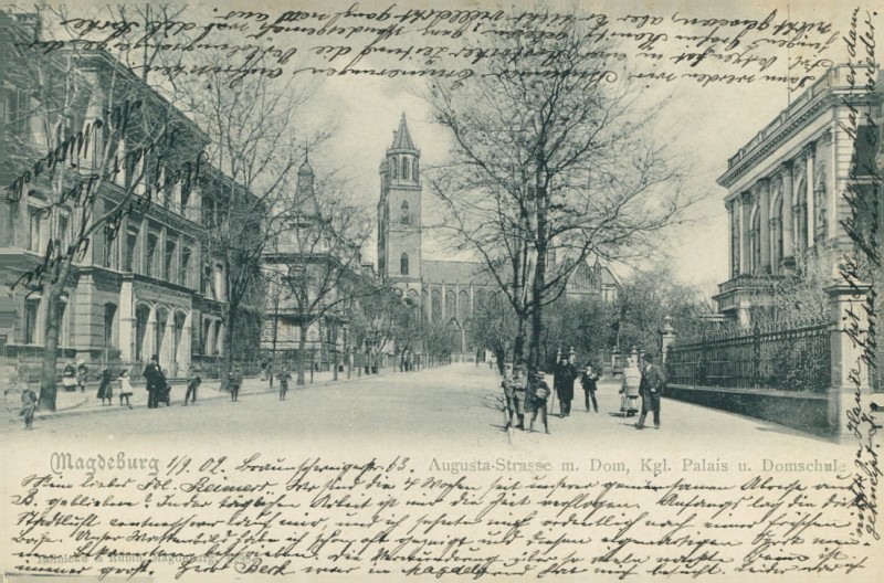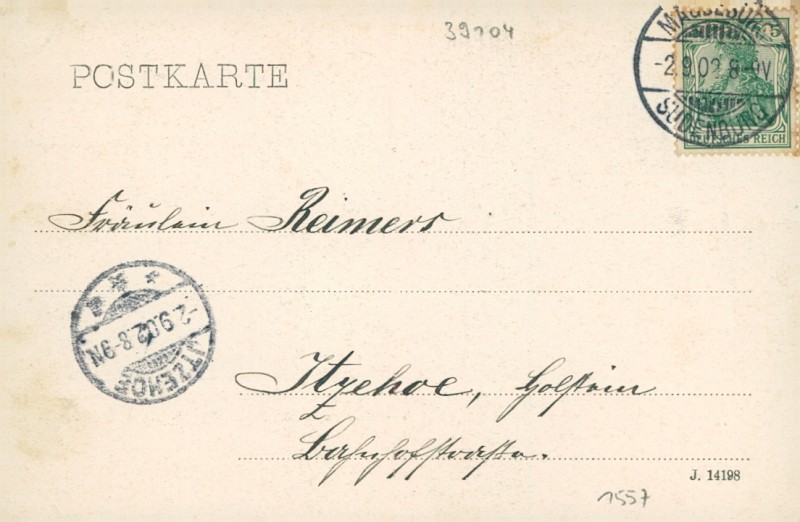 Alte Ansichtskarte aus Magdeburg, gelaufen am 02.09.1902 von Magdeburg nach Itzehoe. Ankunft in Itzehoe am 02.09.1902.