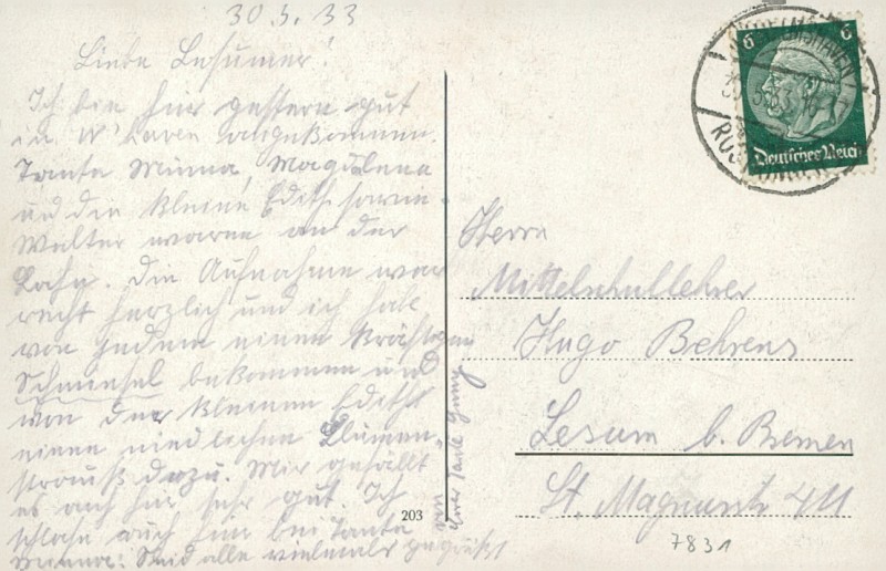Alte Ansichtskarte aus Wilhelmshaven, gelaufen am 30.05.1933 von Wilhelmshaven nach Lesam.