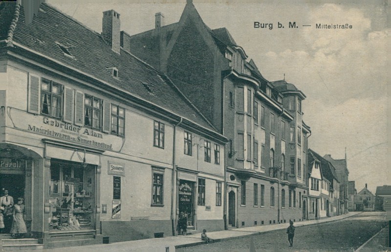 Mittelstraße mit Materialwaren- u. Samenhandlung Gebrüder Adam