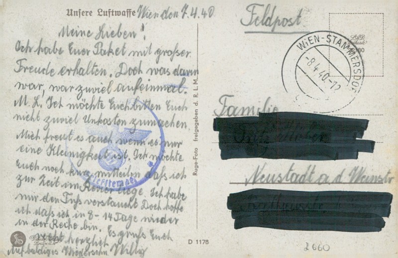 Alte Ansichtskarte, gelaufen am 08.04.1940 von Wien-Stammersdorf nach Neustadt a. d. Weinstr.