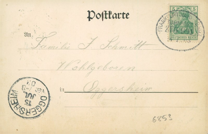 Alte Ansichtskarte aus Steinbach-Umweg, gelaufen am 14.07.1903 von Frankfurt (Main)-Basel (Bahnpost Zug 991) nach Oggersheim. Ankunft in Oggersheim am 15.07.1903.