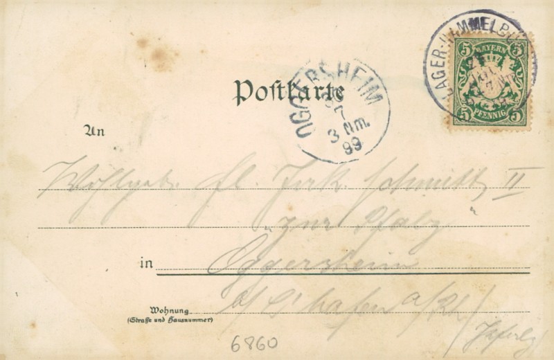 Alte Ansichtskarte aus Hammelburg, gelaufen am 29.07.1899 von Lager Hammelburg nach Oggersheim.