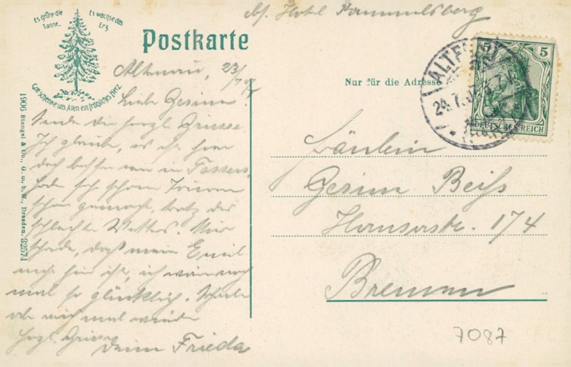 Alte Ansichtskarte aus Altenau-Schulenberg, gelaufen am 24.07.1907 von Altenau nach Bremen.