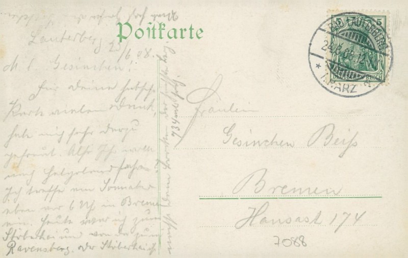 Alte Ansichtskarte aus Bad Lauterberg im Harz, gelaufen am 24.08.1908 von Bad Lauterberg nach Bremen.