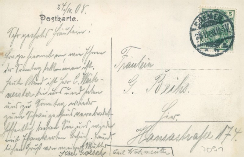Alte Ansichtskarte aus Bremen, gelaufen am 25.11.1908 von Bremen nach Bremen.
