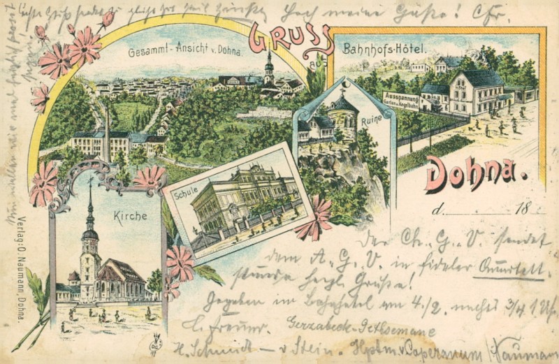 Alte Ansichtskarte aus Dohna-Müglitztal, gelaufen am 05.03.1899 von Dohna nach Dresden. Ankunft in Dresden am 05.03.1899.