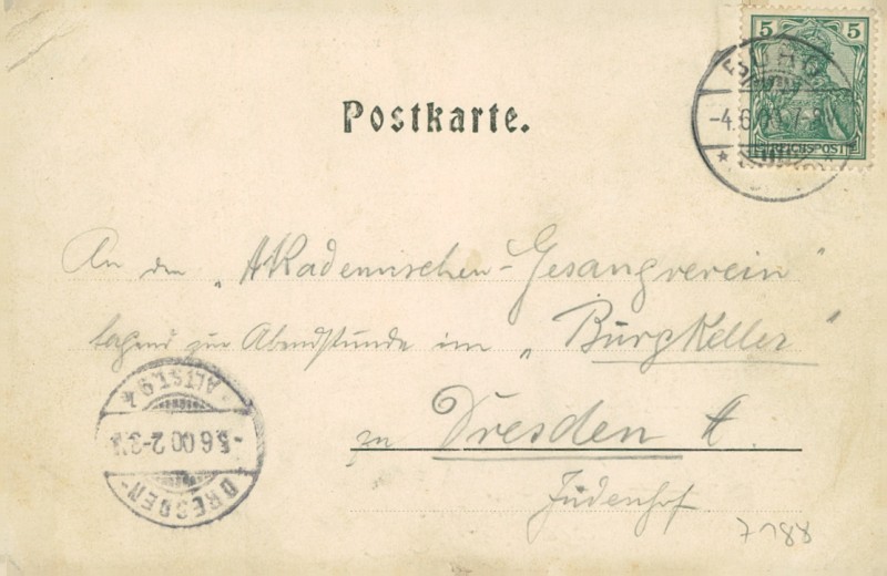 Alte Ansichtskarte aus Solingen, gelaufen am 04.06.1900 von Burg nach Dresden. Ankunft in Dresden am 05.06.1900.