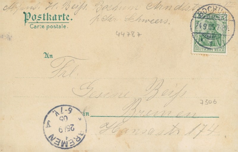 Alte Ansichtskarte aus Bochum, gelaufen am 24.09.1905 von Bochum nach Bremen. Ankunft in Bremen am 25.09.1905.