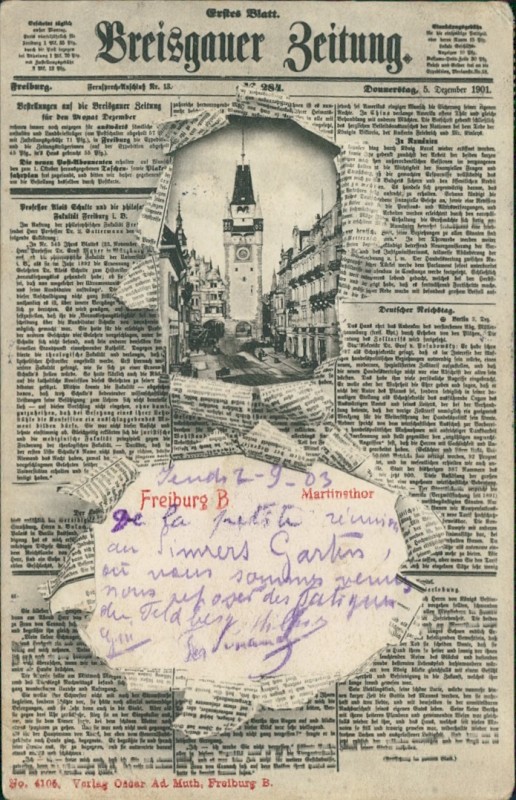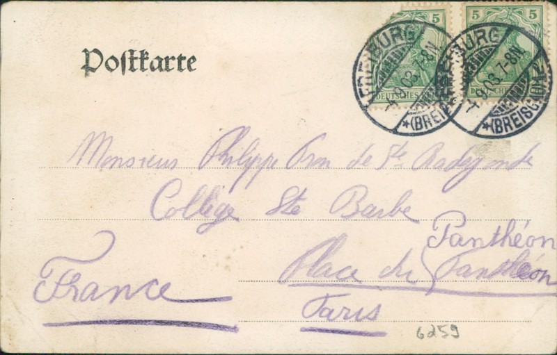 Alte Ansichtskarte aus Freiburg im Breisgau, gelaufen am 04.09.1903 von Freiburg (Breisgau) nach Paris.