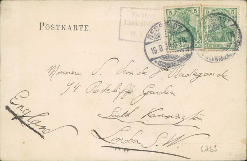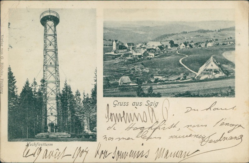 Alte Ansichtskarte aus Lenzkirch-Saig, gelaufen am 19.08.1903 von Neustadt (Schwarzwald) nach London.