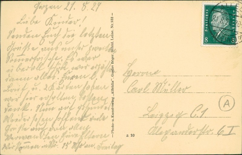 Alte Ansichtskarte aus Alfeld (Leine), gelaufen am 21.08.1929 von Alfeld (Leine) nach Leipzig.