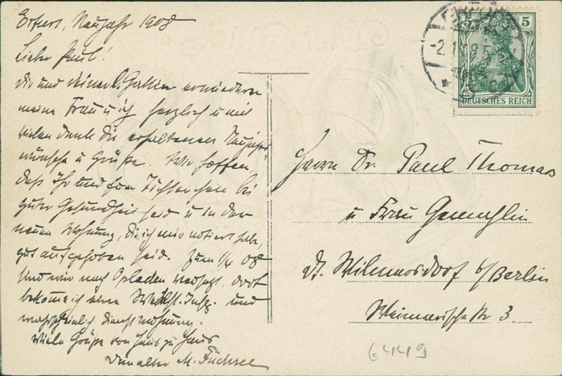 Alte Ansichtskarte, gelaufen am 02.01.1908 von Erfurt nach Wilmersdorf.