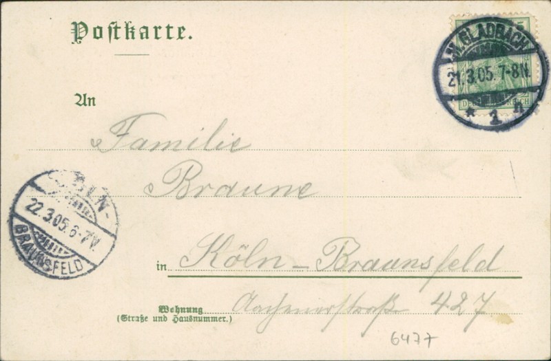 Alte Ansichtskarte aus Mönchengladbach, gelaufen am 21.03.1905 von M.Gladbach nach Köln-Braunsfeld. Ankunft in Köln-Braunsfeld am 22.03.1905.