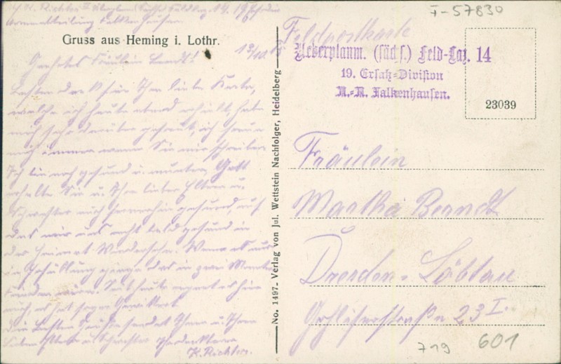 Alte Ansichtskarte aus Heming / Héming, gelaufen um 1915.