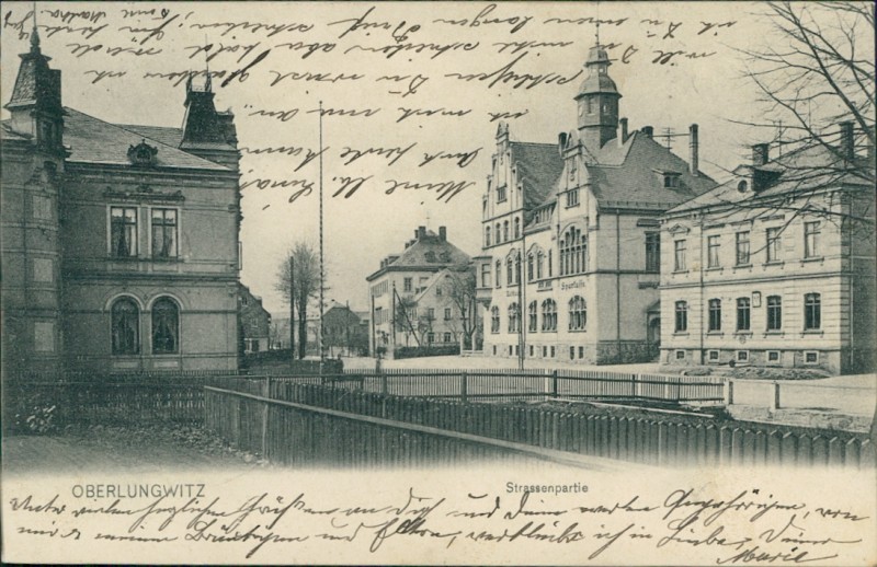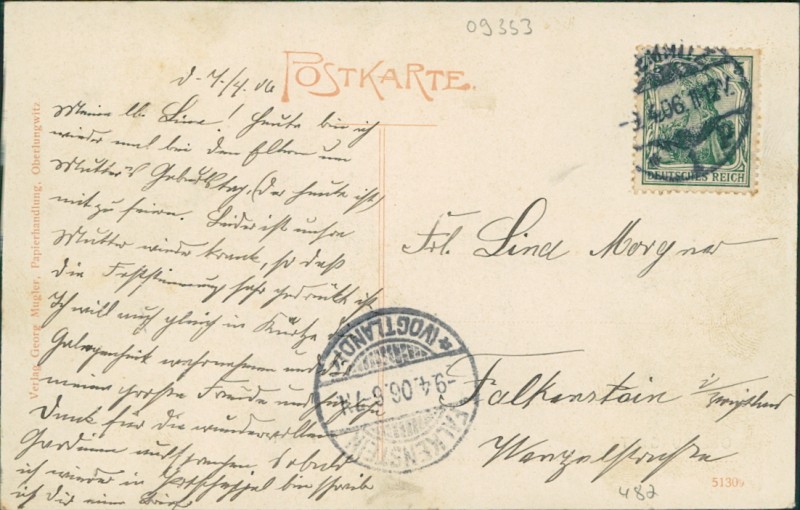 Alte Ansichtskarte aus Oberlungwitz, gelaufen am 09.04.1906 von Oberlungwitz nach Falkenstein. Ankunft in Falkenstein am 09.04.1906.