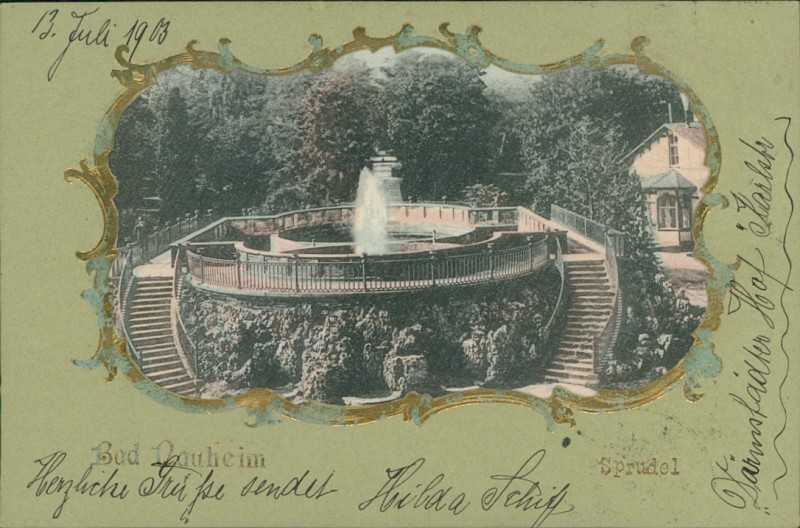 Alte Ansichtskarte aus Bad Nauheim, gelaufen am 12.07.1903 von Bad Nauheim nach Frankfurt. Ankunft in Frankfurt am 13.07.1903.