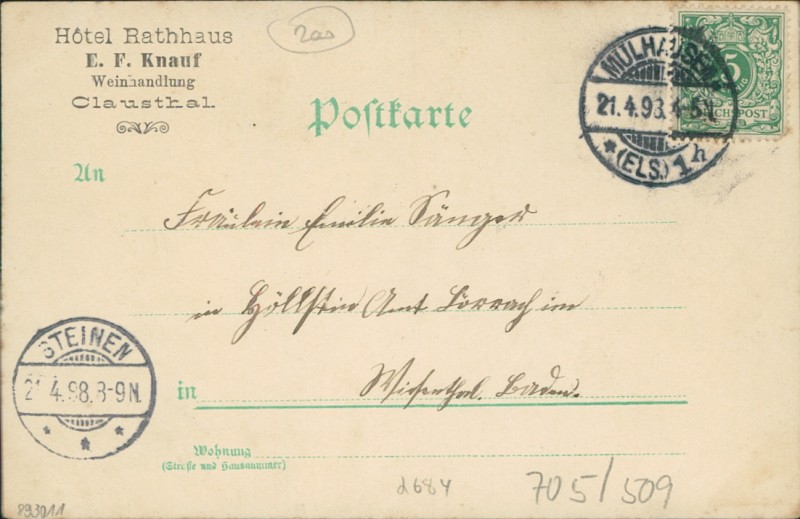 Alte Ansichtskarte aus Clausthal-Zellerfeld, gelaufen am 21.04.1898 von Mülhausen (Els.) nach Steinen. Ankunft in Steinen am 24.04.1898.
