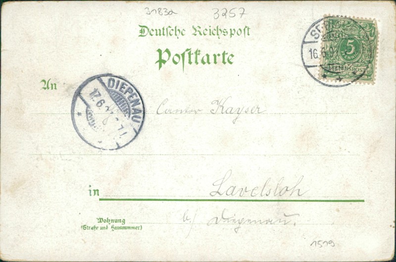Alte Ansichtskarte aus Springe, gelaufen am 16.06.1897 von Springe nach Diepenau. Ankunft in Diepenau am 17.06.1897.
