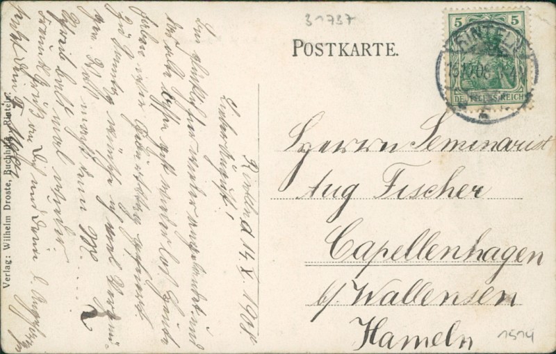 Alte Ansichtskarte aus Rinteln, gelaufen am 15.10.1908 von Rinteln nach Capellenhagen.