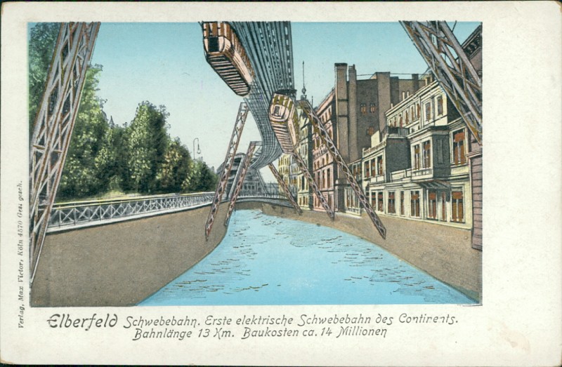 Schwebebahn. Erste elektrische Schwebebahn des Continents. Bahnlänge 13 km. Baukosten ca. 14 Million (goldene Fenster)