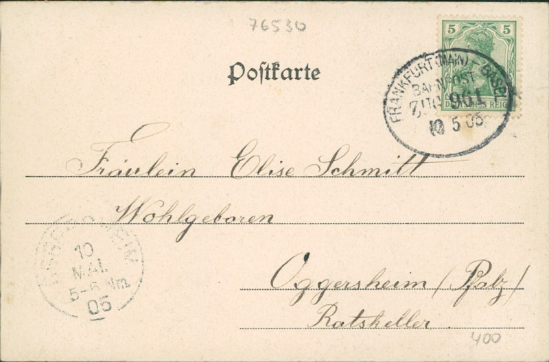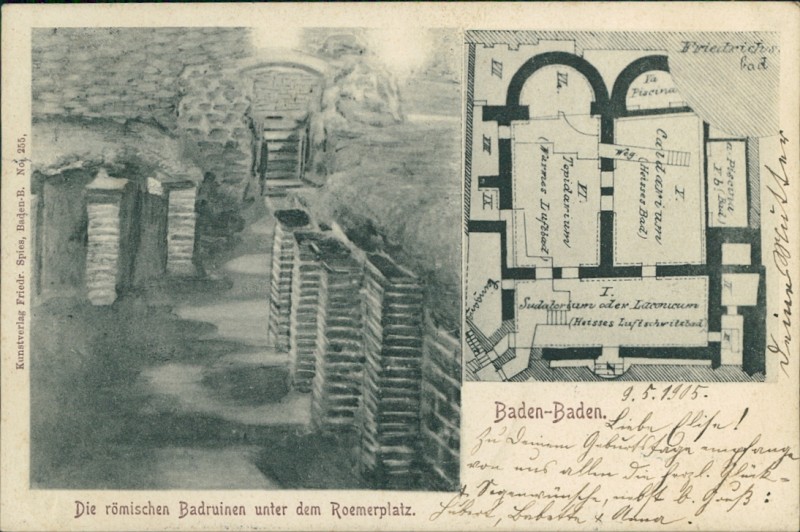 Alte Ansichtskarte aus Baden-Baden, gelaufen am 10.05.1905 von Frankfurt (Main)-Basel (Bahnpost Zug 961) nach Oggersheim. Ankunft in Oggersheim am 10.05.1905.