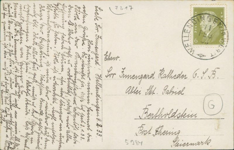 Alte Ansichtskarte aus Wellendingen, gelaufen am 11.02.1933 von Wellendingen nach Bertholdsheim.