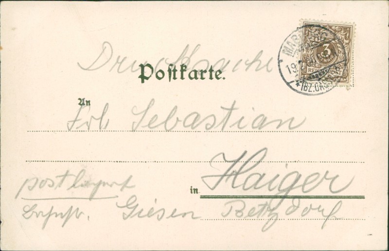Alte Ansichtskarte aus Marburg, gelaufen am 19.02.1900 von Marburg nach Haiger.