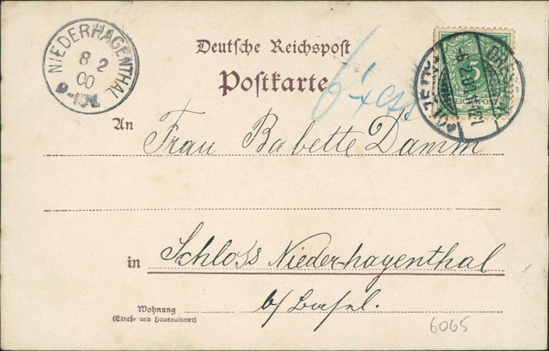 Alte Ansichtskarte aus Dresden, gelaufen am 06.02.1900 von Dresden nach Niederhagenthal. Ankunft in Niederhagenthal am 08.02.1900.