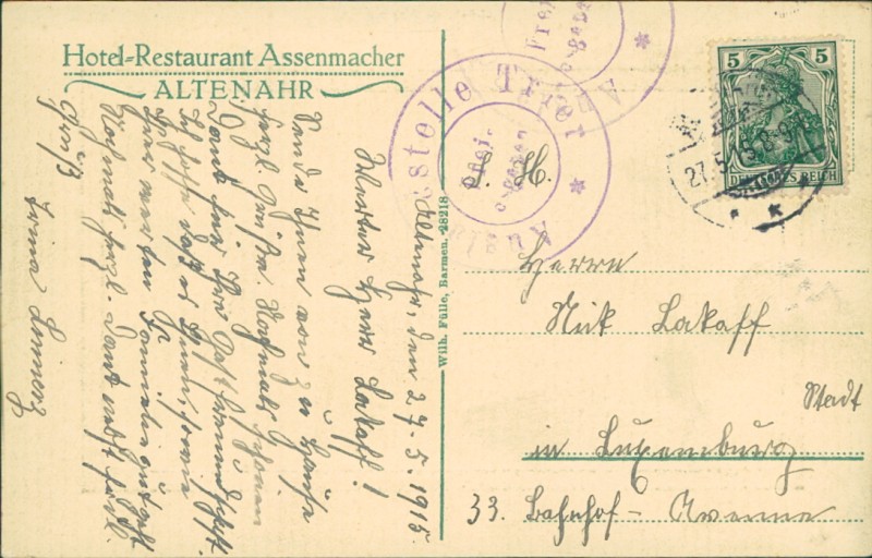 Alte Ansichtskarte aus Altenahr, gelaufen am 27.05.1915.