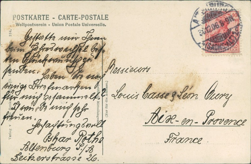 Alte Ansichtskarte aus Altenburg, gelaufen am 20.12.1906 von Altenburg (Sachs-Alt) nach Aix-en-Provence.