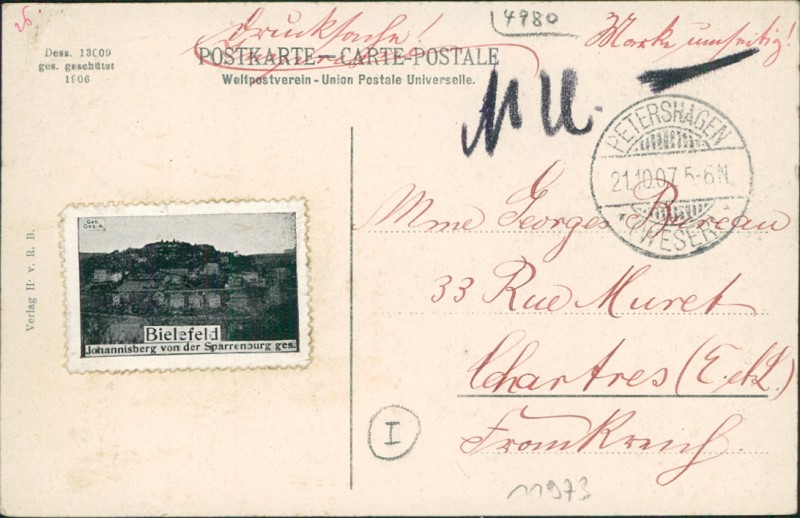 Alte Ansichtskarte aus Bünde, gelaufen am 21.10.1907 von Petershagen (Weser) nach Chartres.
