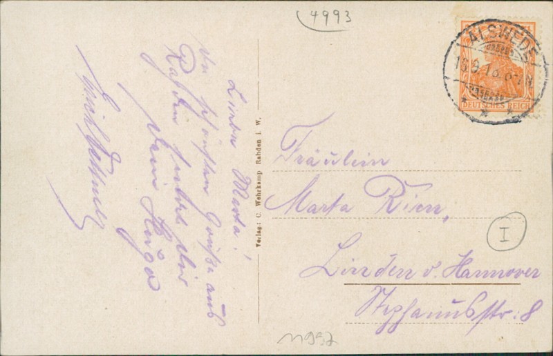 Alte Ansichtskarte aus Rahden, gelaufen am 16.09.1918 von Alswede nach Linden.