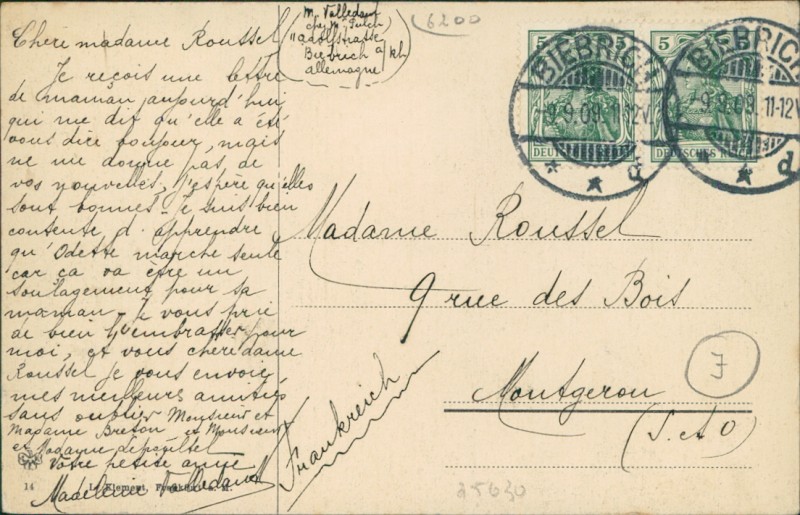 Alte Ansichtskarte aus Wiesbaden-Biebrich, gelaufen am 09.09.1909 von Biebrich nach Montgeron.