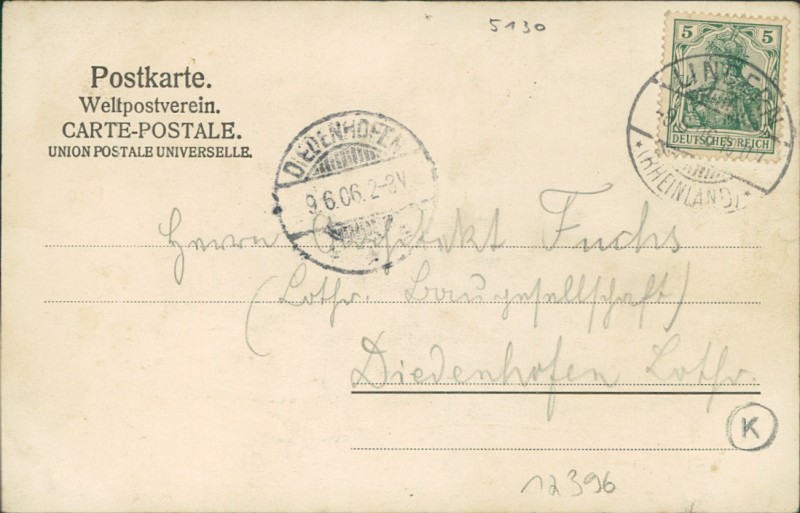 Alte Ansichtskarte aus Geilenkirchen-Lindern, gelaufen am 08.06.1906 von Lindern (Rheinland) nach Diedenhofen. Ankunft in Diedenhofen am 09.06.1906.