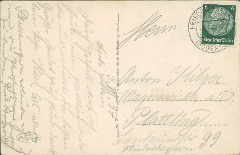 Alte Ansichtskarte, gelaufen am 03.07.1937 von Friedrichshafen (Bodens.) nach Plattling.