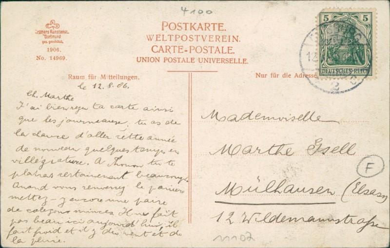Alte Ansichtskarte aus Duisburg, gelaufen am 12.08.1906 von Duisburg nach Mülhausen Elsass.