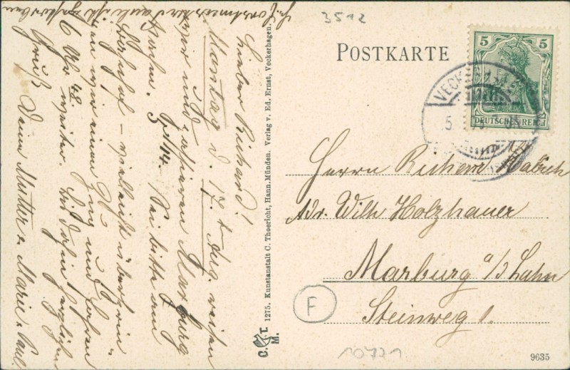 Alte Ansichtskarte aus Reinhardshagen-Veckerhagen, gelaufen um 1909 von Veckerhagen nach Marburg a/d Lahn.