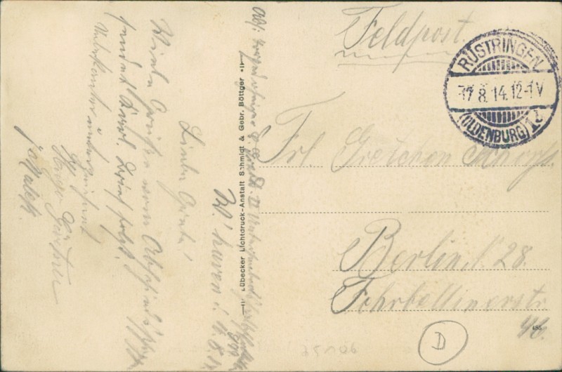 Alte Ansichtskarte, gelaufen am 17.08.1914 von Rüstringen (Oldenburg) nach Berlin.