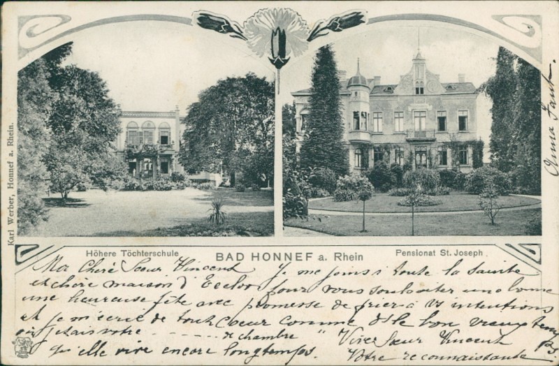 Alte Ansichtskarte aus Bad Honnef, gelaufen am 18.07.1904 von Honnef (Rhein) nach Eecloo. Ankunft in Eecloo am 19.07.1904.