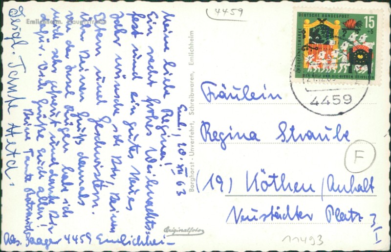 Alte Ansichtskarte aus Emlichheim, gelaufen am 21.12.1963 von Emlichheim nach Köthen.