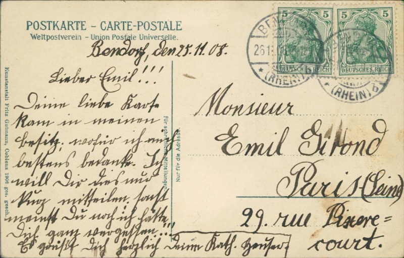 Alte Ansichtskarte aus Bendorf, gelaufen am 26.11.1908 von Bendorf (Rhein) nach Paris.