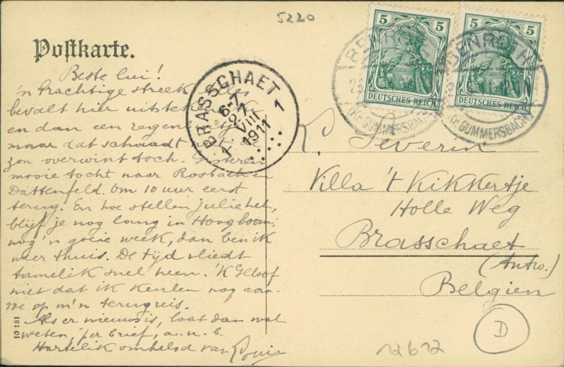 Alte Ansichtskarte aus Waldbröl, gelaufen am 26.08.1911 von Benroth nach Brasschaet. Ankunft in Brasschaet am 17.08.1911.