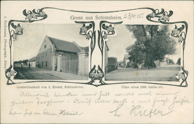 Alte Ansichtskarte aus Armsheim-Schimsheim (Wörrstadt), gelaufen am 24.04.1905 von Armsheim nach Lauterbach. Ankunft in Lauterbach am 25.04.1905.