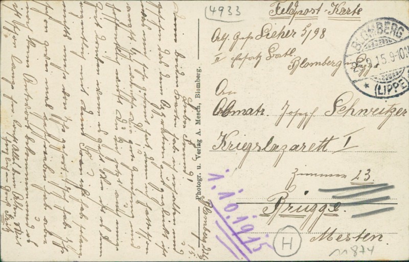 Alte Ansichtskarte aus Blomberg, gelaufen am 26.09.1915 von Blomberg (Lippe) nach Brügge.