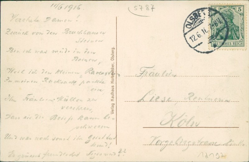 Alte Ansichtskarte aus Olsberg, gelaufen am 12.06.1916 von Olsberg nach Köln.