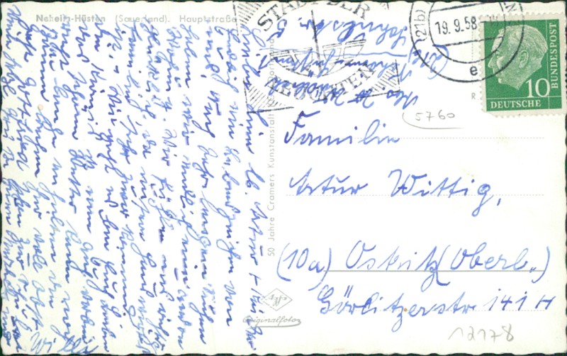 Alte Ansichtskarte aus Neheim-Hüsten (Arnsberg), gelaufen am 19.09.1958.