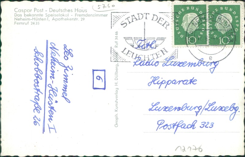 Alte Ansichtskarte aus Neheim-Hüsten (Arnsberg), gelaufen am 17.08.1959 von Neheim-Hüsten nach Luxemburg.