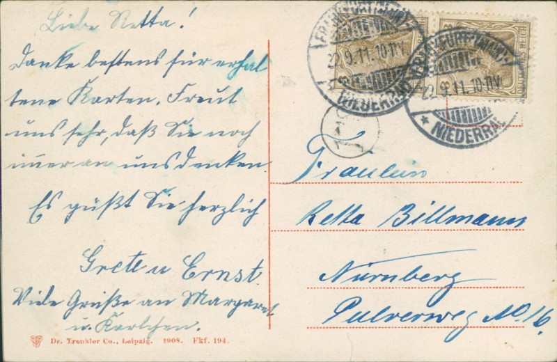 Alte Ansichtskarte aus Frankfurt am Main, gelaufen am 22.09.1911 von Frankfurt (Main) Niederrad nach Nürnberg.