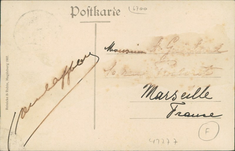 Alte Ansichtskarte aus Ludwigshafen am Rhein, gelaufen am 02.05.1909 von Ludwigshafen nach Marseille.