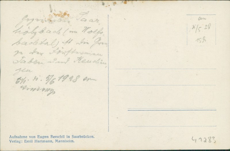 Alte Ansichtskarte aus Mettlach-Saarhölzbach, beschrieben um 1928.